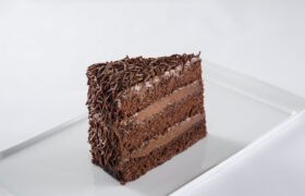 Fatia de bolo de chocolate, recheado e coberto com mousse de chocolate. Nosso mousse é feito com chocolate amargo e cacau belga.